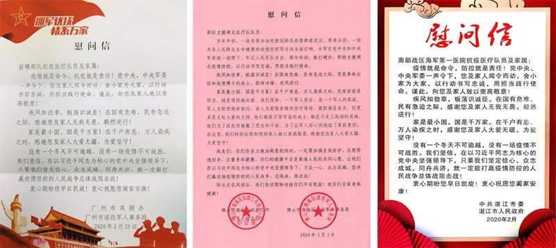 广东省各地市双拥部门本着既温暖又实用的原则,召开动员部署会,因地制宜设计慰问活动方案,通过丰富的慰问形式,增强“五个一”活动的针对性和时效性。2月25日,广州市双拥办专程组织到南部战区总医院、南部战区空军医院,走访慰问驻穗部队驰援湖北抗疫一线医务人员家属,每人赠送价值2000余元的家庭生活和防疫急需慰问品,联合广州市邮政公司,设计制作医务人员和家属的专属慰问信。