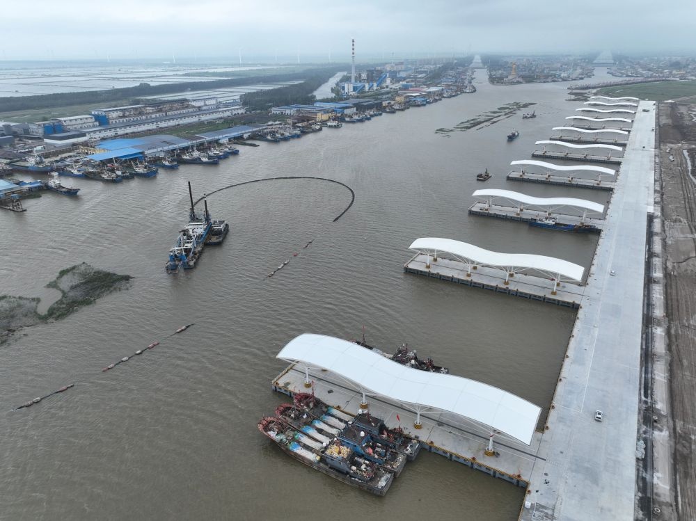 江苏盐城黄沙港国家中心渔港二期工程于2024年9月建成试运营,包含2022.42米顺岸码头、16座突堤码头及配套设施,是国内首座全自动化渔业码头,配备智能卸货系统、水产品交易区、冷冻仓储等设施。