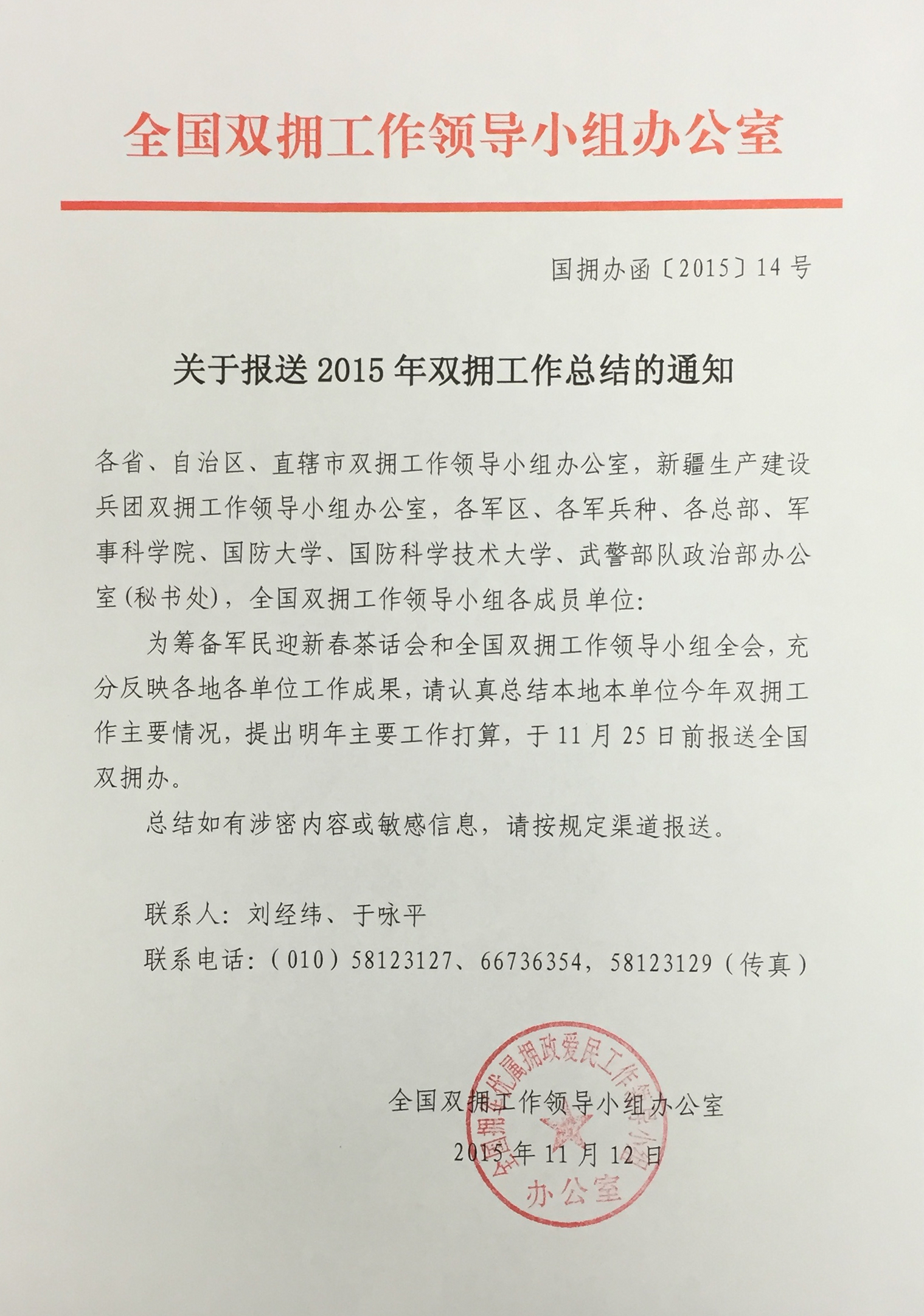 关于报送2015年双拥工作总结的通知