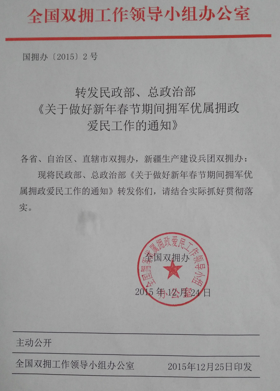 2016年新年春节期间,各地各部队各部门要认真贯彻党的十八大和十八届三中、四中、五中全会精神,以邓小平理论、“三个代表”重要思想、科学发展观为指导,深入学习贯彻习近平总书记系列重要讲话精神,结合节日特点和自身实际,扎实做好拥军优属、拥政爱民工作,大力营造军爱民、民拥军,军民团结一家亲的浓厚社会氛围。