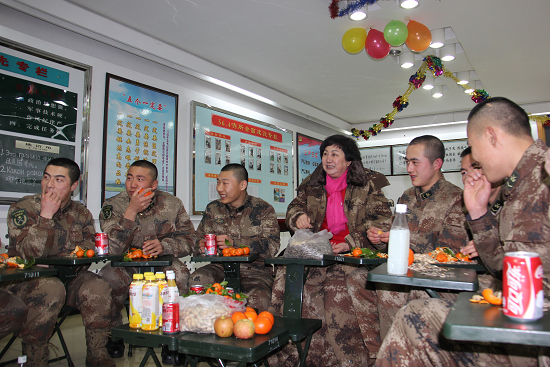 吃完饺子后,官兵们拿出水果、瓜子、花生等年货摆放在活动室,与朱妈妈一起围坐在电视机前,有说有笑地欣赏着丰盛的央视春晚盛宴。愉快的时光总是过得很快,新年的钟声即将敲响,朱妈妈又开始忙着为大家煮年夜饺子。一个个饱满的饺子在沸腾的水里翻滚着,一如战士们此刻的心情,因为这个特殊的除夕夜而激动和幸福。不一会儿工夫,一盘盘热气腾腾的饺子就新鲜出锅了,朱妈妈端起煮熟的第一盘饺子,登上20多米高的哨塔,为正在站岗执勤的哨兵张宏伟和蒲光银送了上去。哨兵张宏伟一边吃着饺子,一边接受记者采访:“虽然我5年没有回家过年,但是今天朱妈妈能够到哨所为我们包饺子,并送上岗楼亲自喂我吃,就像自己亲妈妈一样,我心里感觉特别温暖。在这个万家团圆的日子,我有幸为人民站岗,为祖国守岁,我觉得特别值得!”